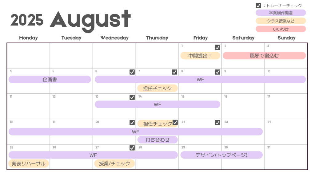 入学して4ヶ月目、折り返し地点です!夏休みやお盆シーズンも挟んだためプライベートの優先度が高くなかなか思うように作業が進みませんでしたが、今月から本格的に卒業制作に突入です!やったことをまとめます!
