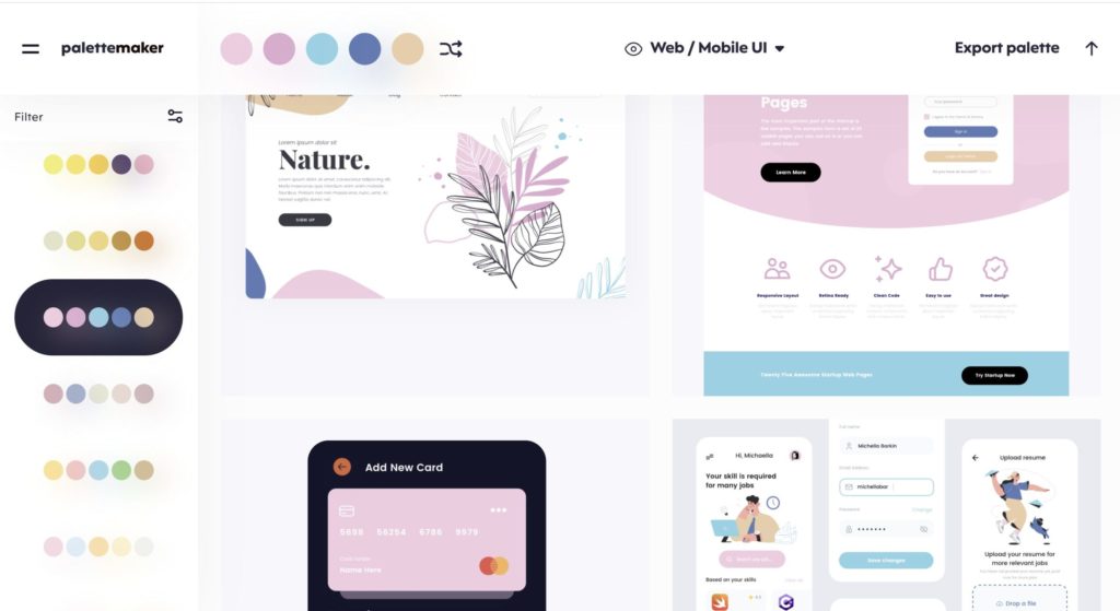 色が決まったら、実際に落とし込んだ時に変じゃないかを確認したいので、palettemakerという配色ツールに色を入れて大体のイメージを膨らまし、色を決定。